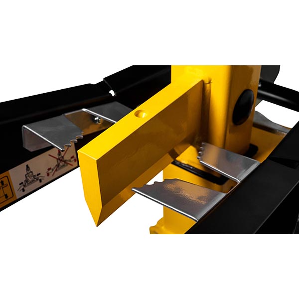 Станок имеет двуручное управление, при эксплуатации устойчив на поверхности, благодаря значительному весу и упорным элементам. Полено закрепляется надежными фиксаторам, исключающими его вылет при работе с дровоколом.
