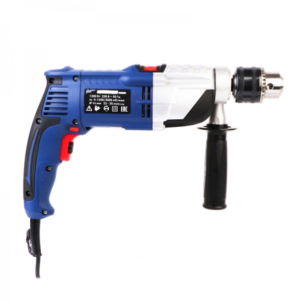 Ограничитель глубины сверления в комплекте. Ударный механизм с храповыми втулками. Двойная изоляция. Реверс.