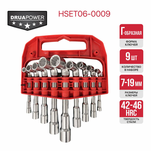 Набор Г-образных ключей под шпильку серии DRUA HSET06-0009 идеален для ремонта автомобилей, работы в мастерских, сборочных работ, изготовления механических соединений, обслуживания прецизионного оборудования.