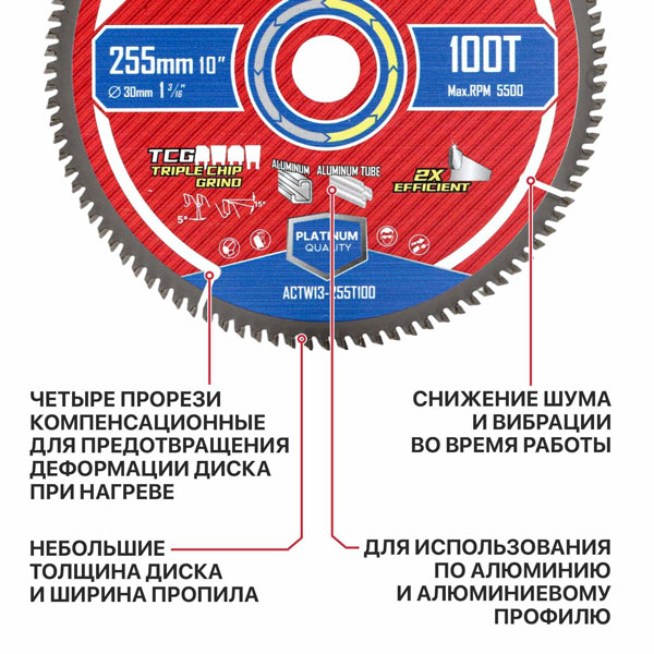 Диск пильный с твердосплавными напайками по алюминию для циркулярных и торцовочных пил ACTW13-255T100 отличный вариант для раскроя алюминия, пластика, алюминиевого и оконного профиля.