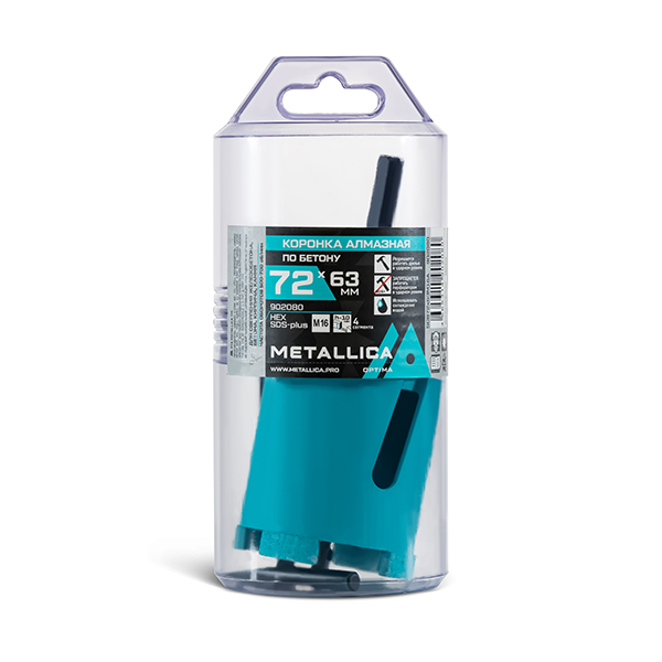 *Серия ULTRA. Мод. SCB72x63M16A. Диаметр 72 мм, длина общая с хвостовиком 165 мм, длина рабочая 63 мм, посадочная резьба М16, количество сегментов 4, высота сегмента 10 мм, рекомендованная частота оборотов 500-700 об/мин. В комплекте 2 хвостовика: SDS-plus - для перфоратора и HEX - для кулачкового патрона дрели, направляющее сверло с коническим хвостовиком, клин для извлечения направляющего сверла из хвостовика. Упаковка - пластиковая туба.