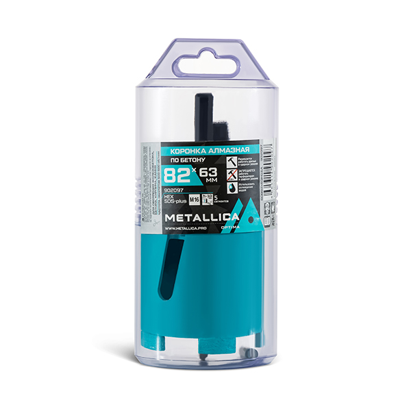 *Серия ULTRA. Мод. SCB82x63M16A. Диаметр 82 мм, длина общая с хвостовиком 165 мм, длина рабочая 63 мм, посадочная резьба М16, количество сегментов 5, высота сегмента 10 мм, рекомендованная частота оборотов 500-600 об/мин. В комплекте 2 хвостовика: SDS-plus - для перфоратора и HEX - для кулачкового патрона дрели, направляющее сверло с коническим хвостовиком, клин для извлечения направляющего сверла из хвостовика. Упаковка - пластиковая туба.