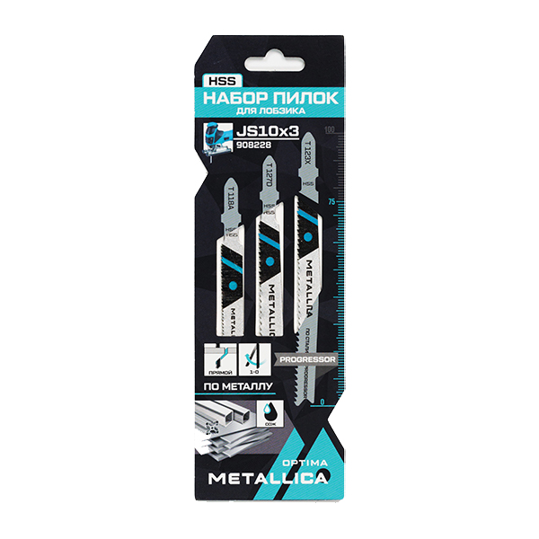Набор пилок для лобзика METALLICA OPTIMA №10 предназначен для пиления листовой стали, стального проката, алюминия и других цветных металлов, пластмасс, дерева с гвоздями. Состав набора: T118A, T127D, T123X по 1 штуке - всего 3 полотна: