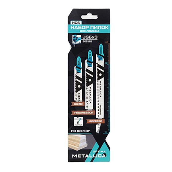 Набор пилок для лобзика METALLICA OPTIMA №6 предназначен для чистого аккуратного пиления дерева, фанеры, ДСП, OSB, МДФ, пластмасс и других не абразивных и неметаллических материалов. Состав набора: T234X, T301BR, T308B, по 1 штуке - всего 3 полотна: