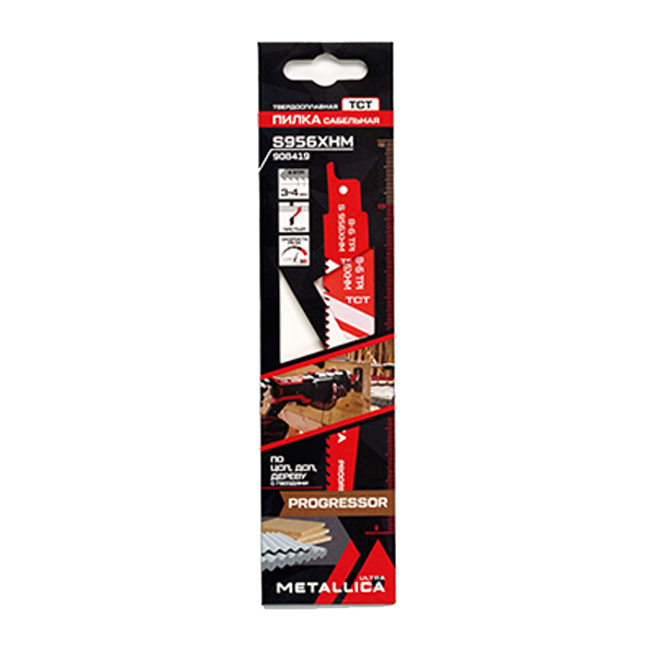 Пилка сабельная твердосплавная PROGRESSOR предназначена для пиления цементно-стружечных плит (ЦСП), шифера, ГВП, ГКЛ, опалубочной доски, дерева с гвоздями, ДСП, абразивных пластиков, пазогребневых плит, пакетов разных материалов. Изготовлена из полосы высококачественной рессорно-пружинной стали 85 (HCS), с напайками из карбида вольфрама ВК-8 твердостью 90HRA. Направление зубов - в сторону хвостовика. Твердосплавные напайки-зубы не разведены, имеют алмазную заточку, уменьшающую налипание материала на зуб для обеспечения высокой производительности. Выполнены с режущим углом +17 град. и задним углом 15 град. - для универсального производительного пиления. Шаг зубов прогрессивный мелкий - 3-4 мм (8-6 TPI) для производительного пиления материалов разной толщины. Ширина полотна 19 мм с сужением к окончанию для возможности криволинейного пиления. Скорость пиления средняя - ниже средней. Рекомендуемая частота хода шатуна сабельной пилы: для дерева - 3000 циклов/мин, для ЦСП, пазогребневой плиты - 2000-2500 циклов/мин, для пластиков 1000-1500 циклов/мин, без охлаждения. Универсальный h-образный хвостовик подходит для всех типов сабельных пил.