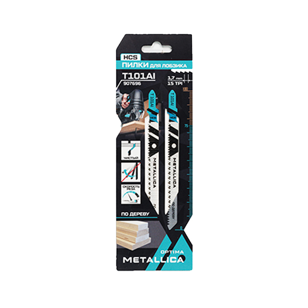 *Серия OPTIMA. Мод. T101AI. Длина общая 100 мм, рабочая 70 мм, шаг 1,7 мм, ширина пропила 1 мм. Эффективная толщина пиления: древесина 3-50 мм, фанера 3-40 мм, ДСП 10-40 мм, пластиковая труба до 50 мм. Упаковка: картонный подвес - 2 шт.