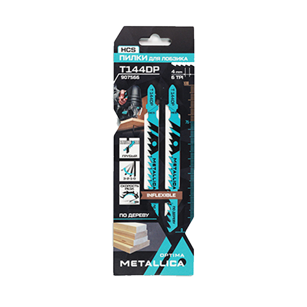 Серия OPTIMA. Мод. T144DP. Длина общая 100 мм, рабочая 75 мм, шаг 4,0 мм, ширина пропила 2,1 мм. Эффективная толщина пиления: древесина 10-50 мм, фанера, ДСП 10-40 мм, пластиковая труба до 60 мм. Упаковка: картонный подвес - 2 шт.